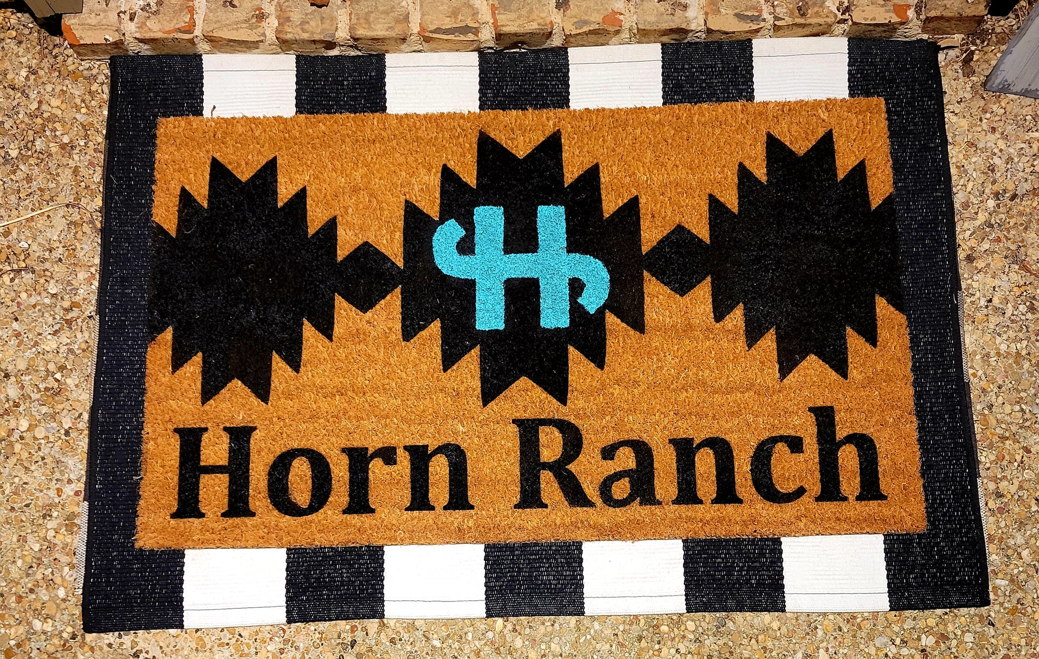 18"x30" coir doormat. Aztec design with personal brand pictured. Family name underneath. Layering rugs not included.
