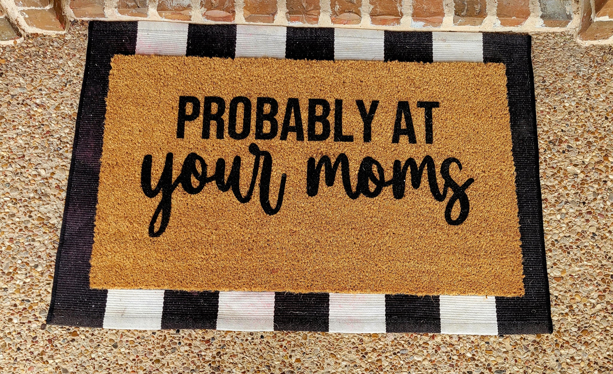 18"x30" coir doormat with text, "probably at your moms". Layering mat not included.